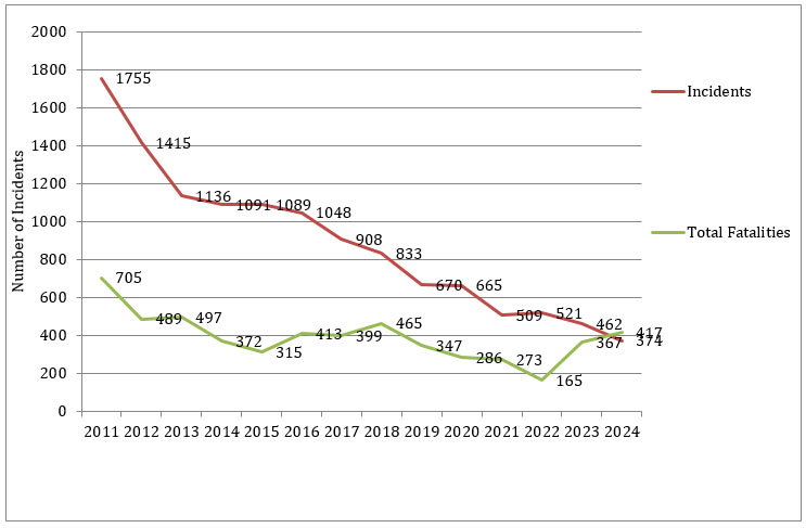 In 2009, the Union government urged states to intensify coordinated anti-Maoist operations across LWE-affected areas—especially in Jharkhand, Chhattisgarh and West Bengal.[4] These targeted offensives led to the killing of senior Maoist leaders, including Azad in 2010 and Kishenji in 2011, disrupted key Maoist command structures, and significantly reduced the capability of Maoists to perpetrate violence. By 2013, Maoist-related incidents and fatalities had markedly declined (see Figure 1). However, the Maoists were not completely defeated. Sporadic but high-impact attacks—such as the Jhiram Ghati ambush in 2013 highlighted that the Maoists still possessed enough cadre and firepower to inflict damage on government personnel and property.
