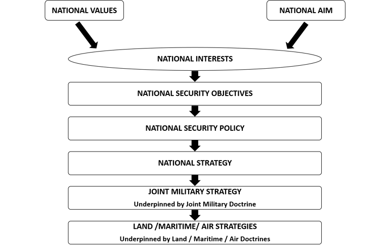 Another key observation from the first chapters of all three editions pertains to the positioning of the maritime doctrine within the echelons of the national security framework. The first edition underscores that a doctrine must be a corollary to the overall national security framework, which articulates the state’s broader priority interests and strategic goals. It states doctrine must exist simultaneously at the grand strategic, military strategic, operational and tactical levels. As a result, the first edition emphasises establishing the hierarchical relationship among the various levels of the national security framework.[21] This element is addressed in the second edition through a more clearly articulated hierarchical framework, illustrated in Figure 1.